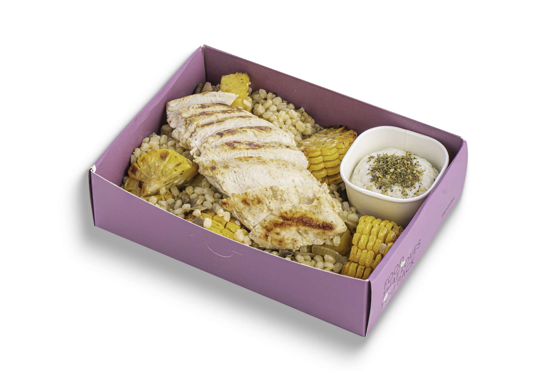 Barley, Onion, Mushrooms, Roasted Corn, Sweet potatoes, Grilled Chicken Breast, Garlic Paste With Zaatar