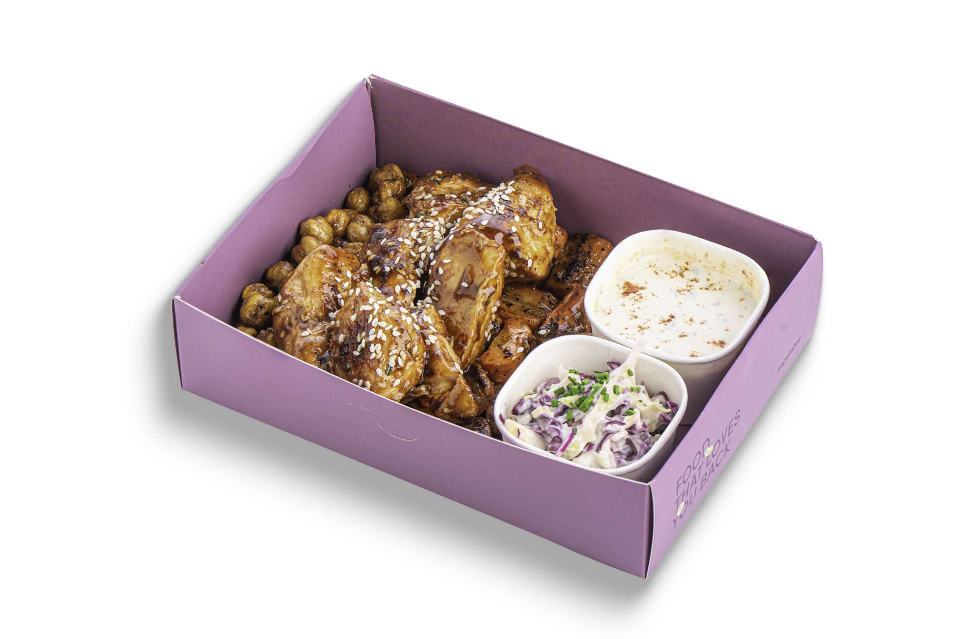 Cripsy Chickpeas, Grilled Chicken Breast Cubes, BBQ Sauce, White Sesame, Roasted Carrots, Homemade Ranch Sauce, Coleslow